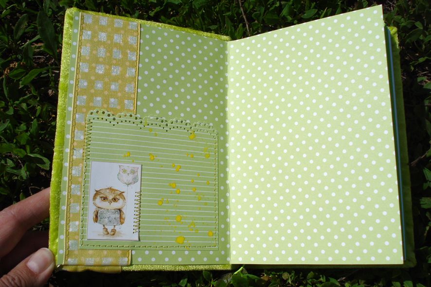 Давным-давно я обнаружила кусочек зеленой бархатной ткани, оставшийся от юбки для Пеппи Длинныйчулок и подумала: какой уютный блокнотик бы вышел... А потом познакомилась с милыми совушками Инги Пальцер и поняла, что они просто созданы для этой тканюшки!!! И вот тогда-то и родилась идея яркого позитивного блокнота с зелеными и белыми страничками...